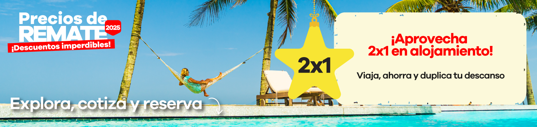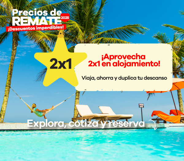 La oferta 2x1 aplica únicamente sobre la porción hotelera de tu reserva. En los productos marcados con la etiqueta 2x1, el precio ya incluye la tarifa con el beneficio aplicado. Para verlo correctamente, siempre debes buscar para dos personas.
