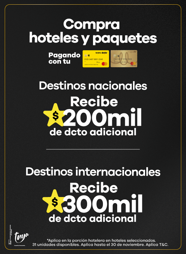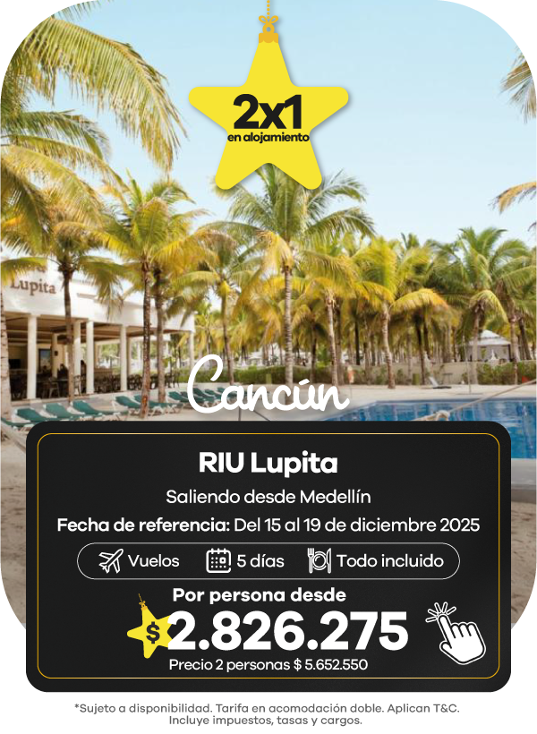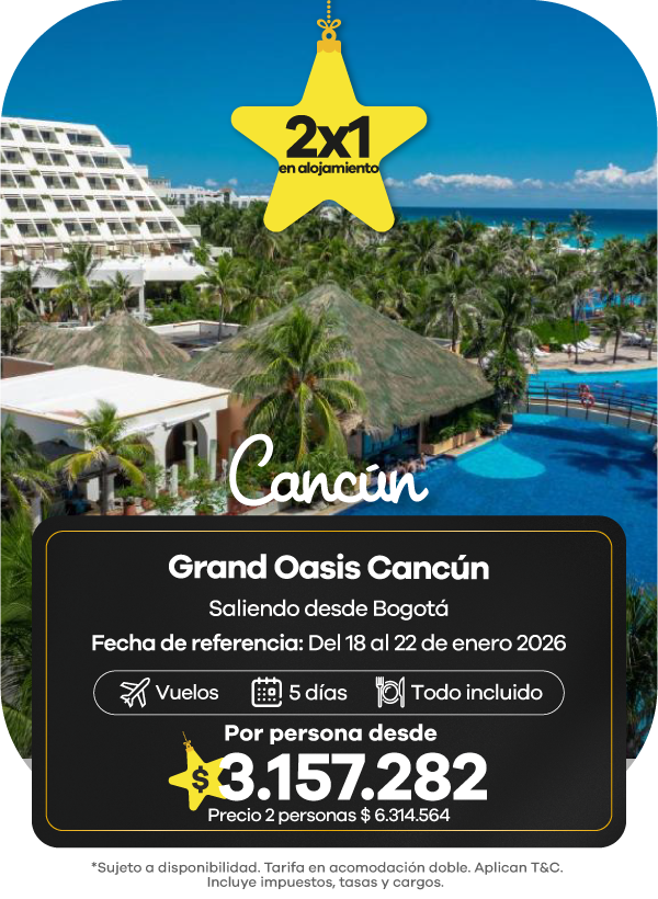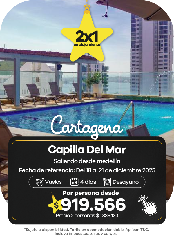 Además, contamos con agencias de viajes en Medellín, Bogotá y Cali listas para asesorarte. Aquí podrás encontrar las mejores ofertas en vuelos y paquetes que se ajustan a tu presupuesto. También aceptamos todos los medios de pago, con la posibilidad de realizar tu pago en cuotas, para que organices tu viaje de manera más flexible.